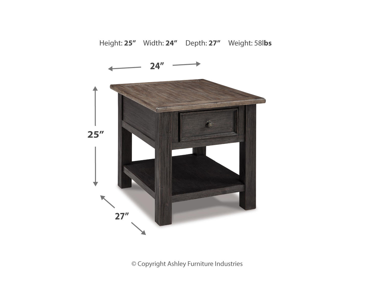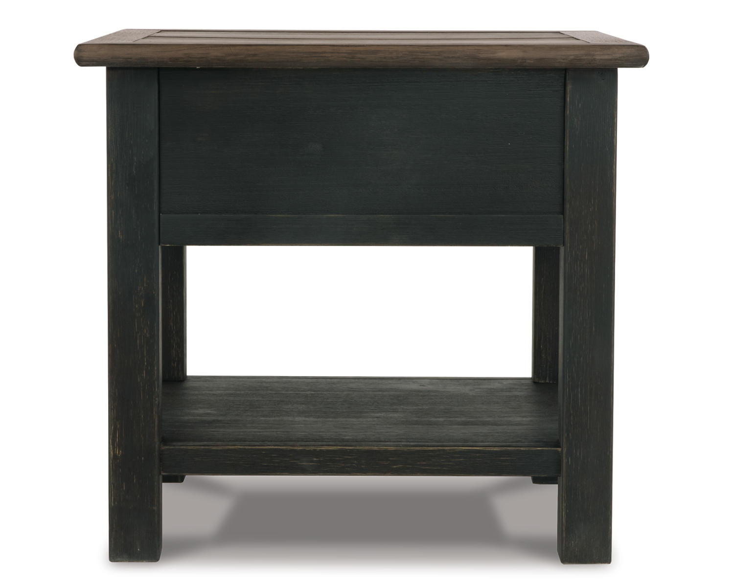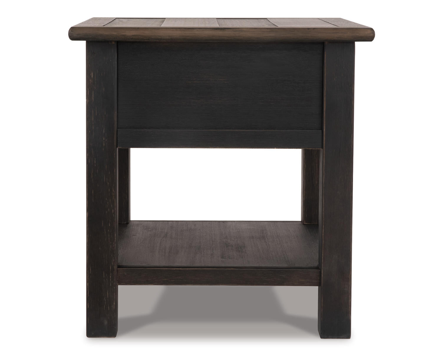 The Tyler Creek End Table is a rectangular accent piece designed for living rooms, bedrooms, and entryways. Its grayish brown/black finish and clean lines blend with a wide range of décor while offering a reliable surface for lamps, remotes, drinks, or decor. This versatile table adds practical style to any space.