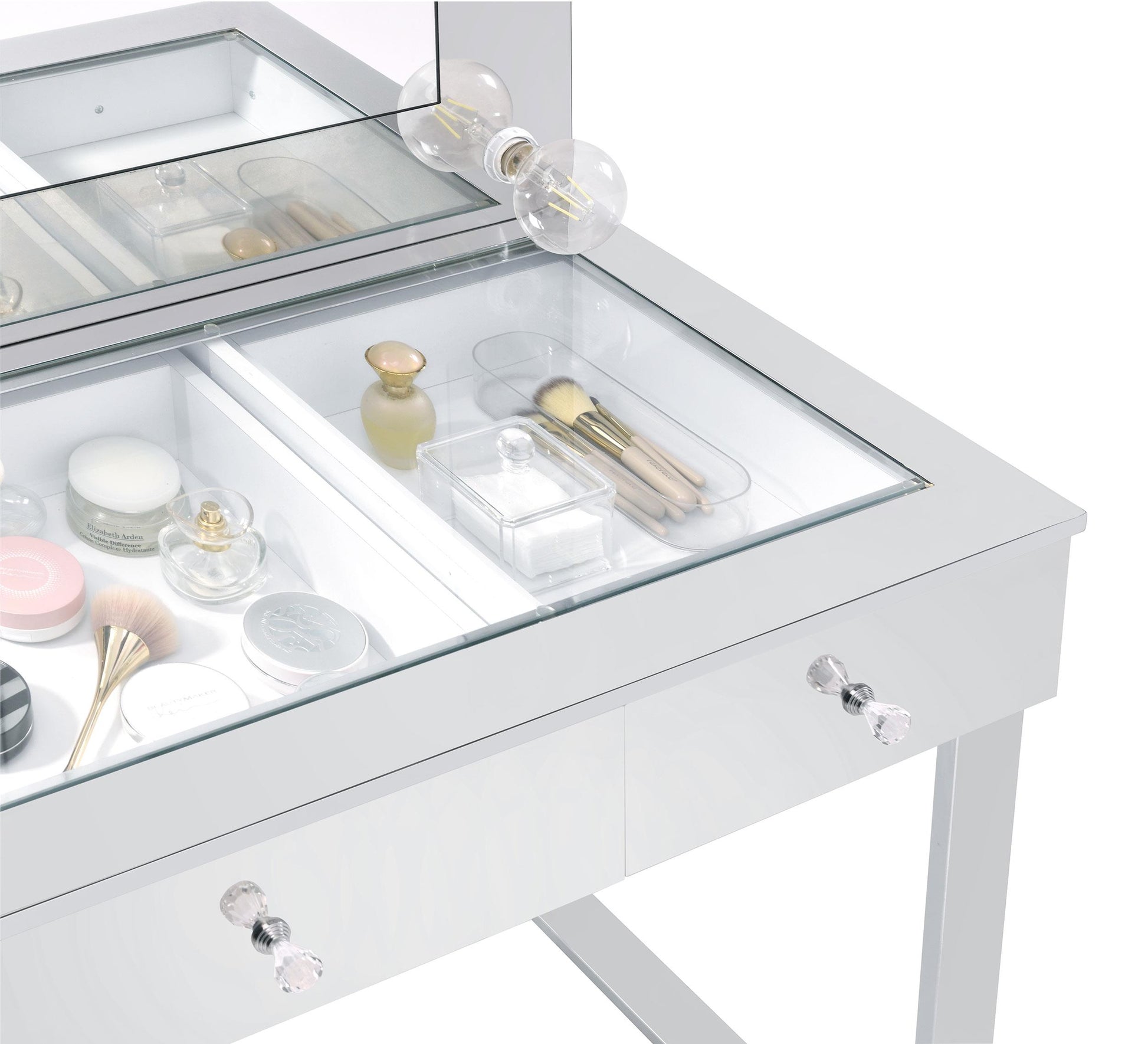 Meet the Umbridge 3-drawer vanity set, a sleek addition to any bedroom or dressing space. Designed for anyone who values organized storage and clean, modern styling, this vanity pairs practical function with a polished chrome and white aesthetic. The built-in lighting adds a practical touch for makeup application and daily routines.