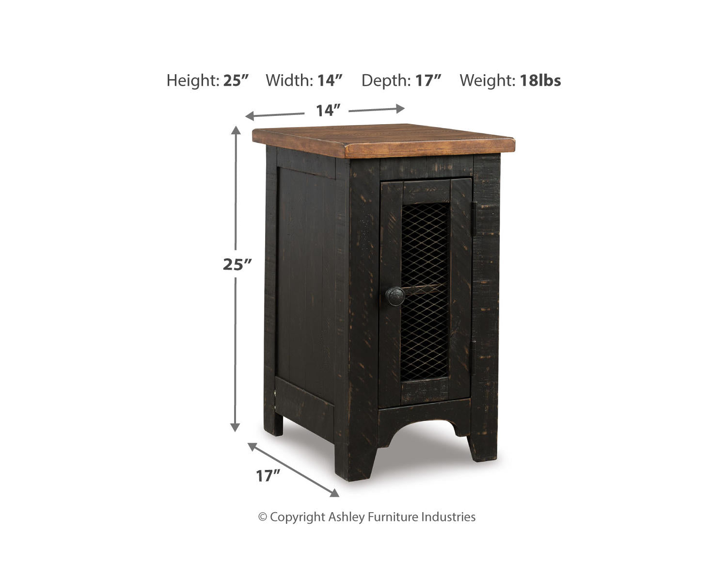 Meet the Valebeck Chairside End Table—a compact, two-tone accent piece designed to sit beside your sofa or chair. Finished in black and brown, it adds handsome contrast to a variety of living room decors while keeping essentials within reach. This practical end table blends clean lines with everyday usability for a tidy, welcoming space.