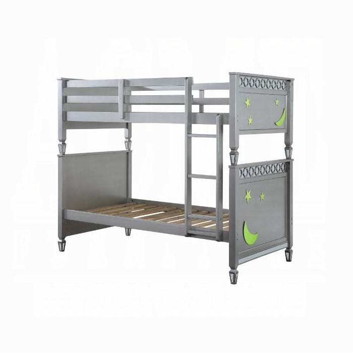 Nothing is more magical than sleeping under the stars. You can bring that magic into your child's bedroom with the Valerie twin over twin bunk bed. In a glimmering silver finish and the featured stars and moon design on the headboard and footboard, this bunk bed adds whimsy to any room while staying practical for everyday use.