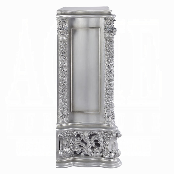 The Valkyrie Chest is a standout piece from the Valkyrie Bedroom Collection, designed for bedrooms that value luxury and craftsmanship. Characterized by button-tufted upholstery, intricate scrollwork, and a lustrous antique platinum finish, it brings sophistication to every space. Ornate carvings with floral scroll design on each piece create dramatic silhouettes that elevate your room.