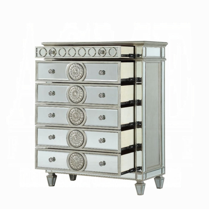 The Varian Chest blends glam drama with practical storage. Featuring a mirror finish and raised geometric patterns, this piece adds a dash of sophistication to bedrooms and living areas. Designed for those who value style and function, it makes a commanding statement while fitting seamlessly with a variety of decor styles.