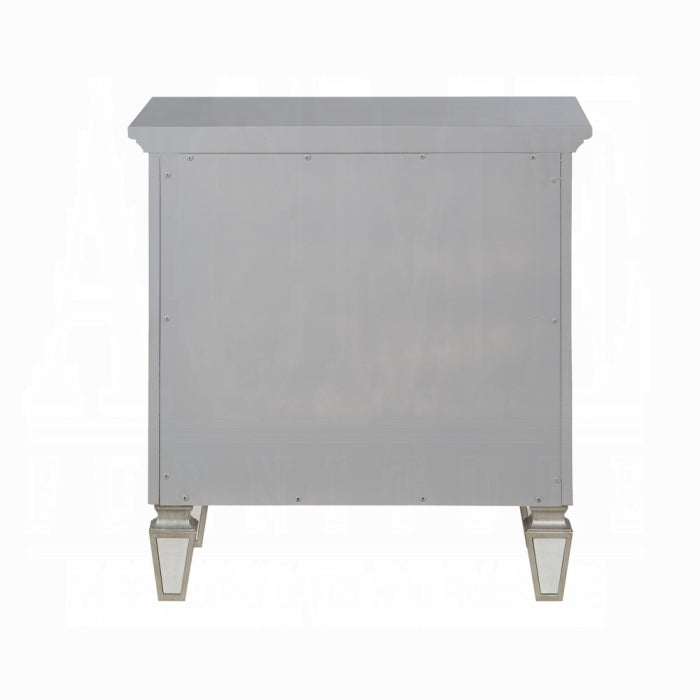 The Varian Nightstand is a refined bedside companion designed to pair with the Varian bedroom collection. It brings a touch of luxury to teen and young adult spaces with its mirrored detailing and silver finish.