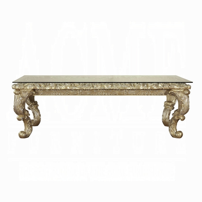 Introducing the Vatican Dining Table, a centerpiece that blends dreamy romantic accents with classic design for traditional dining rooms. It showcases intricate trim with scrolling vines and floral elements, finished in champagne gold to add opulence and sophistication.
