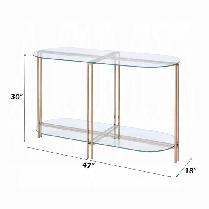 The Veises Sofa Table brings chic, versatile style to your living space. Designed for the living room, bedroom, or den, it’s the perfect stage for your books, photos, and treasured trinkets. Its oval clear glass tabletop paired with a gold metal frame offers a distinctive accent you’ll notice from every angle.
