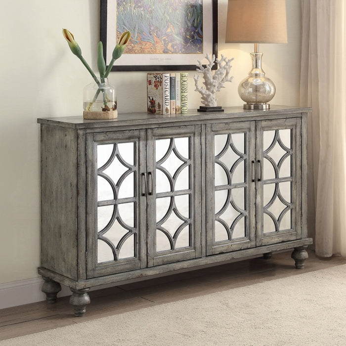 The Velika Console Cabinet is a transitional storage piece designed for living rooms, entryways, or dining spaces. It blends a weather gray finish with mirrored glass doors and a diamond trim inlay for a contemporary yet timeless presence. Four cabinet doors open on a wood console to reveal ample shelf space for organizing essentials while keeping a clean, sophisticated look.
