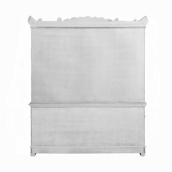 Commanding attention in any dining space, the Vendome Buffet & Hutch blends timeless craftsmanship with practical display. This piece captures old-world charm through scrolling motifs, curved silhouettes, and leaf molding accents. Finished in an antique pearl tone with hand-brushed detailing, it delivers a refined, enduring presence in your dining room.