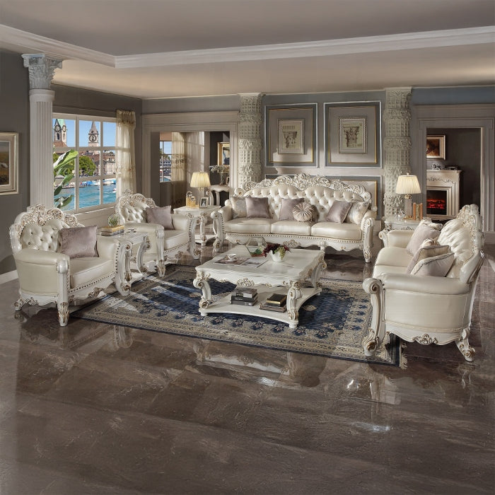 Rich and bold describe the Vendome oversized sofa. It features a glistening pearl white synthetic leather finish for an upscale look. The elaborate details on the frame and legs—oversized scrolls paired with crystal-like button tufting on the backrests—bring traditional charm and luxury to any living space.