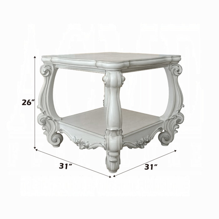 Meet the Versailles End Table, a square silhouette designed for living rooms, entryways, or bedrooms. It features a bone white finish and a durable blend of wood, veneer, and poly resin. This table offers a sturdy surface for lamps, books, and decor, with a clean, timeless look. It ships in a knock-down carton for safer transit.