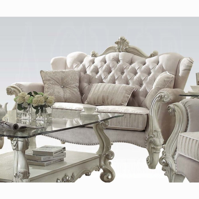 The Versailles collection in a bone white finish brings an elegant, warm, and traditional touch to your living room. This loveseat blends classic design with comfortable seating, making it a refined focal point for everyday living. Its decorative base, scrolled feet, and refined upholstery add timeless character to any space.