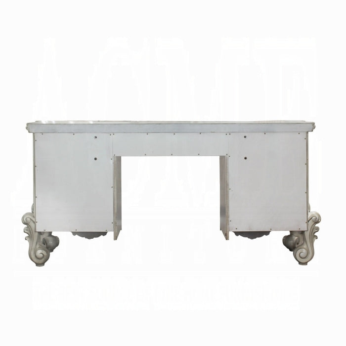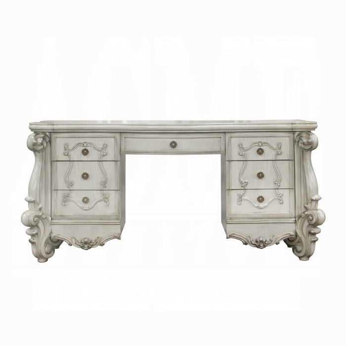 The Versailles vanity desk is the perfect accent to create the style of royalty your bedroom has been needing. This vanity is crafted in wood with a bone white finish, inspired by old European design, featuring brown copper metal hardware and intricate wood carvings on the front of the seven drawers.
