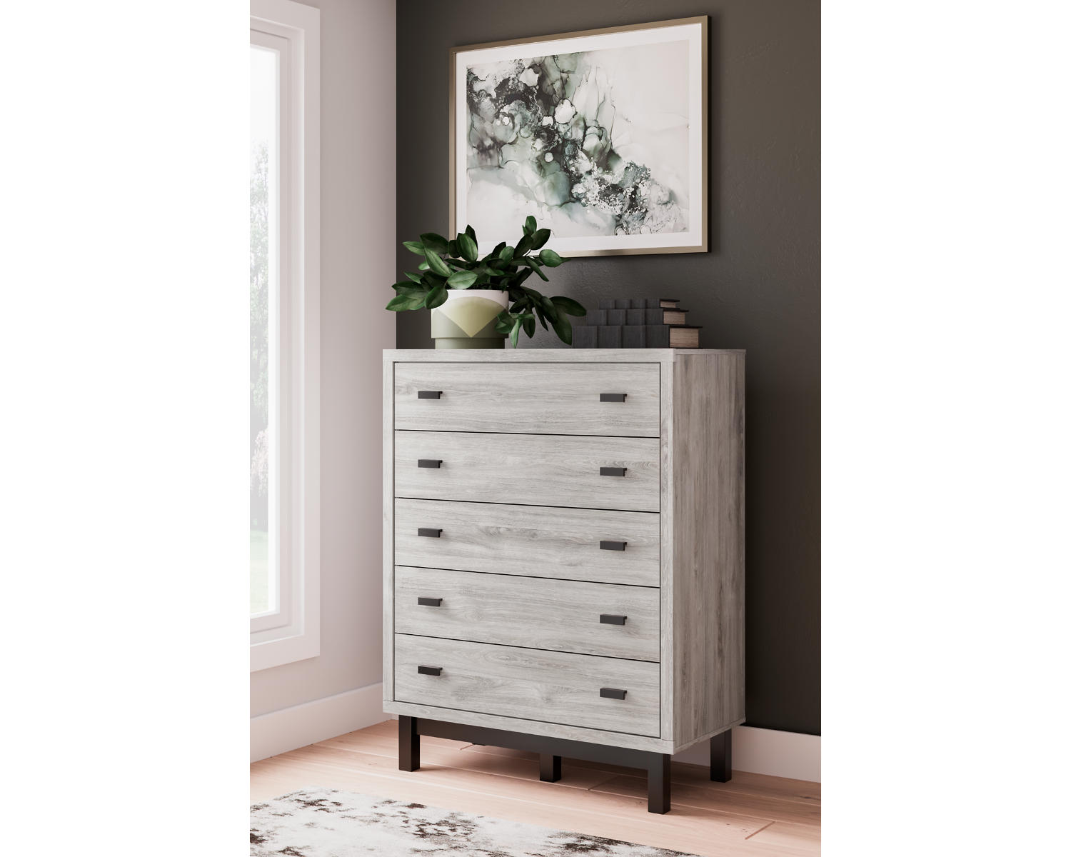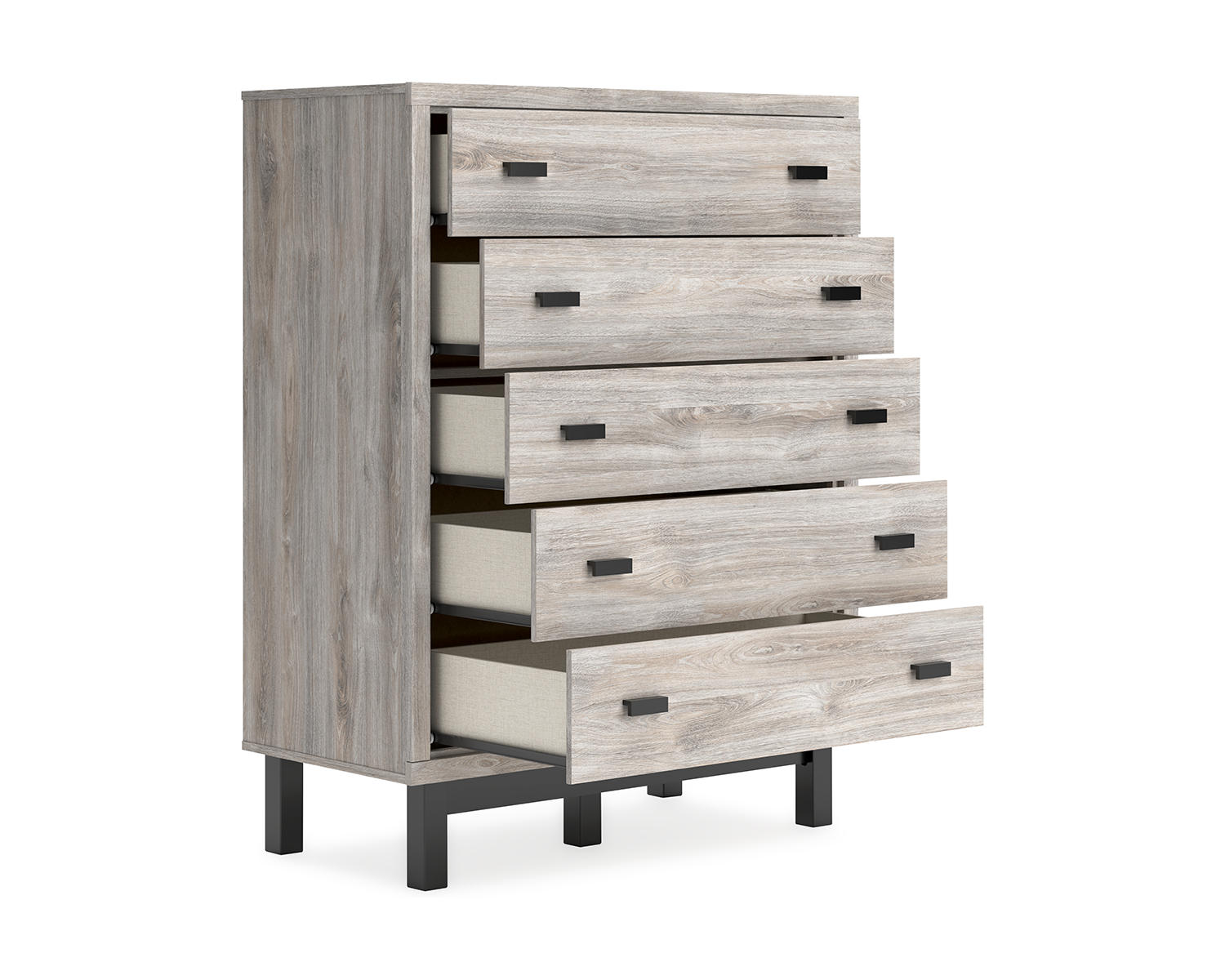 Meet the Vessalli Chest of Drawers—a five-drawer wide dresser designed for modern bedrooms and organized living. With a two-tone finish, it blends clean lines with versatile style. Ideal for spaces that require extra storage without compromising aesthetics.
