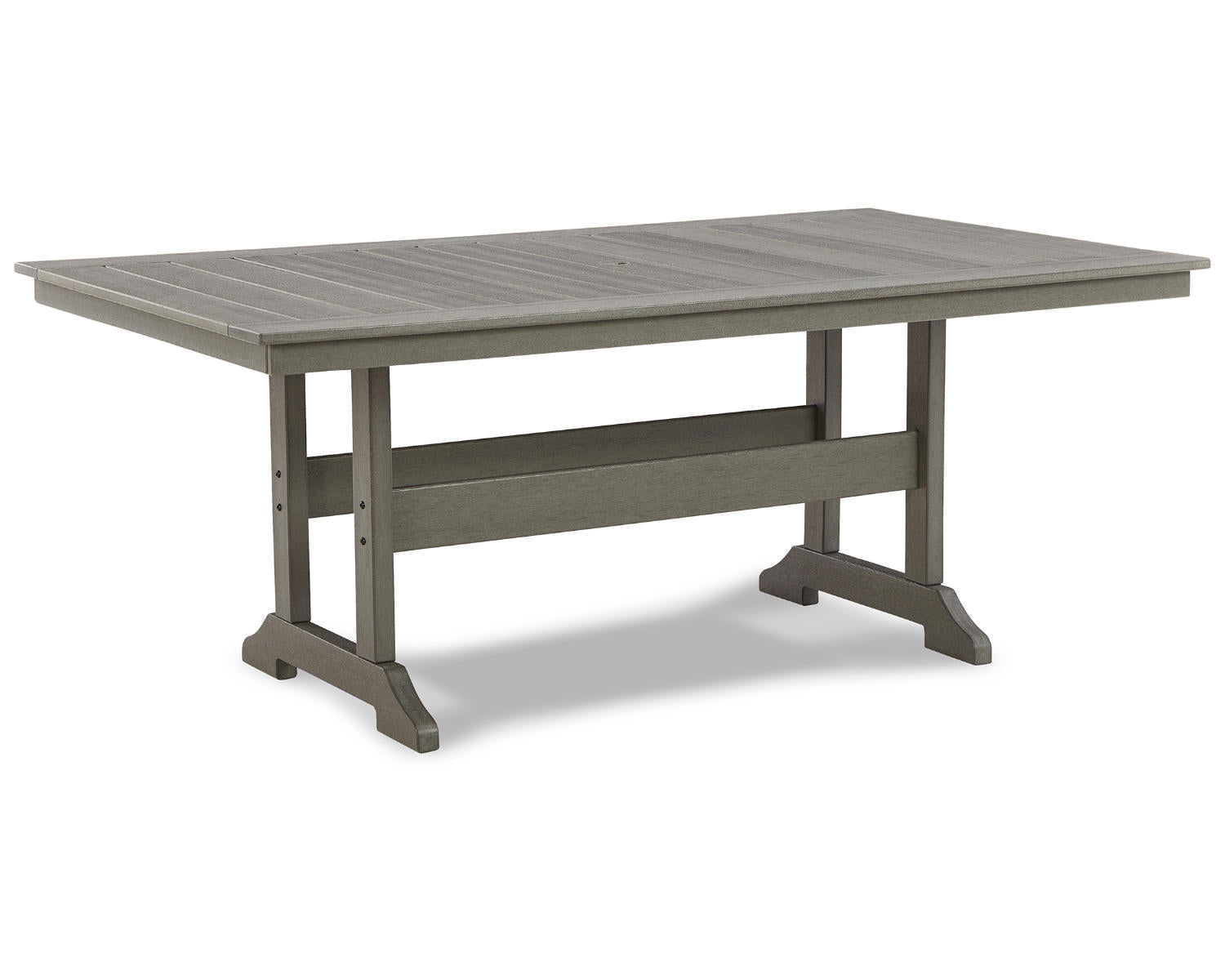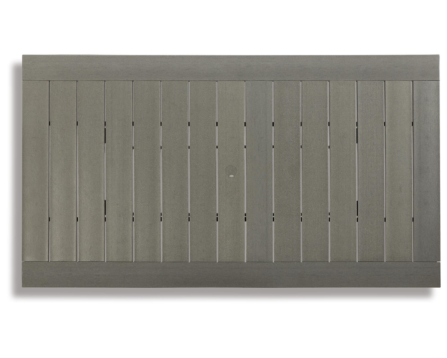 The Visola Outdoor Dining Table is a rectangular outdoor table designed for al fresco dining. Ideal for patios, decks, and backyards, it features a gray finish and an umbrella option to keep guests shaded on sunny days. This table combines clean lines with versatile functionality, making outdoor hosting easier and more enjoyable.