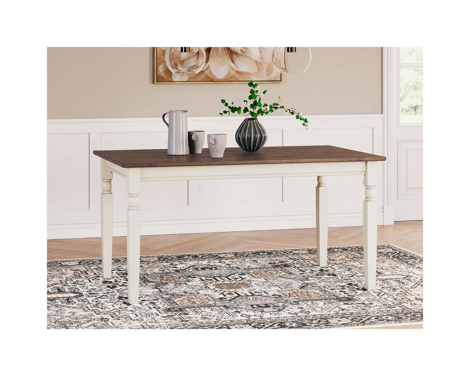 - Shape and finish: Rectangular dining table in a durable two-tone Brown and Cottage White finish.