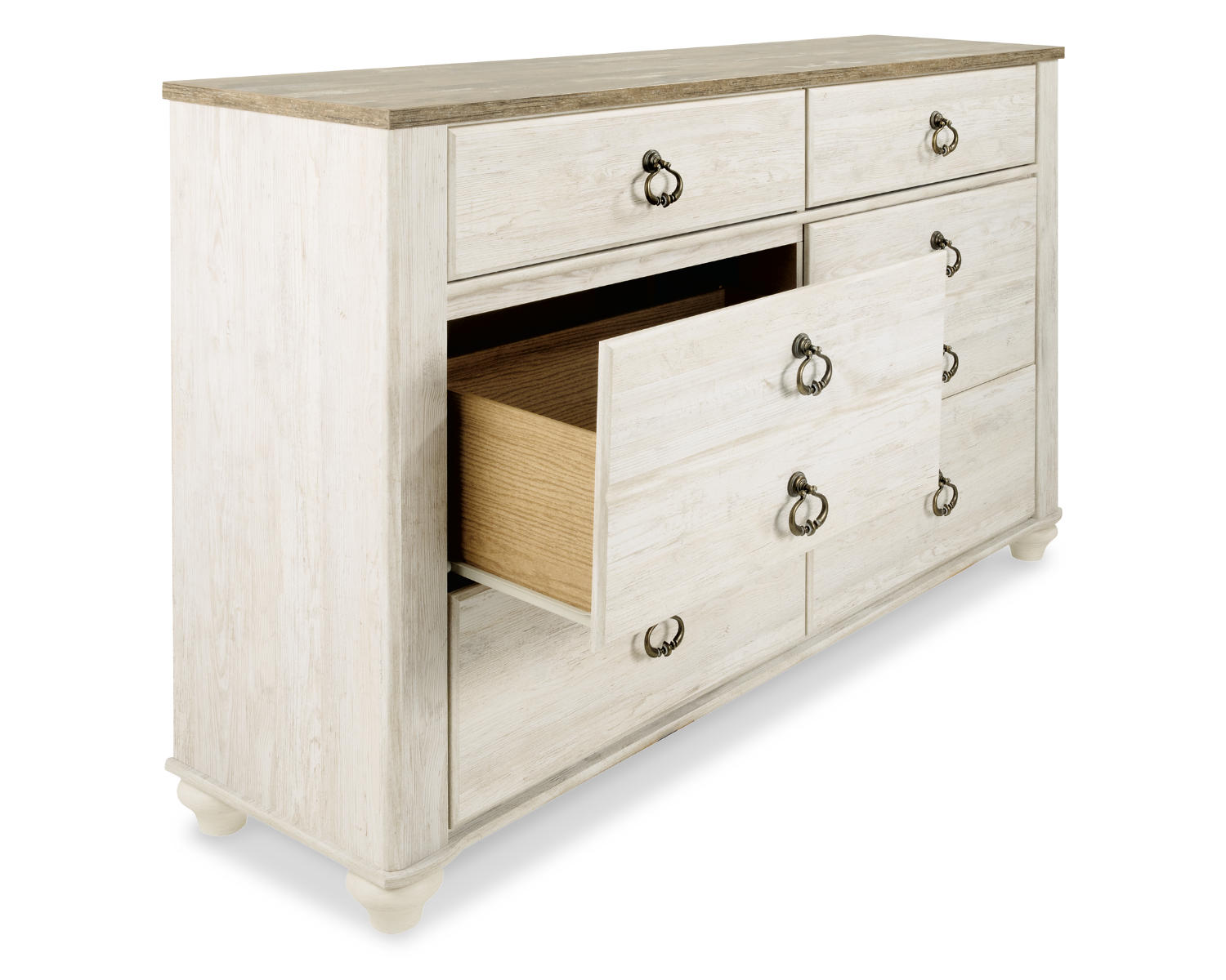 Meet the Willowton Dresser—an elegant six-drawer storage piece designed for everyday use. This whitewash dresser is ideal for bedrooms that value clean lines and practical organization. It brings a timeless, versatile look that pairs with a variety of decors.