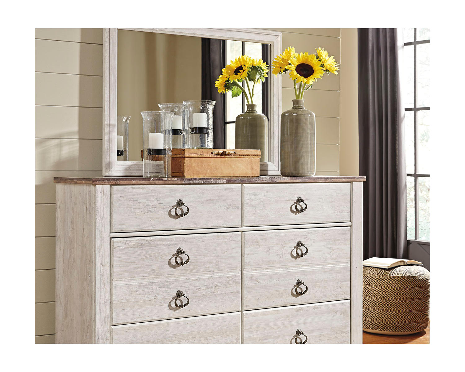 Meet the Willowton Dresser and Mirror, a versatile storage and styling solution designed for bedrooms of any size. Finished in a soft whitewash, this two-piece set brings a fresh, timeless look and practical organization to your space.