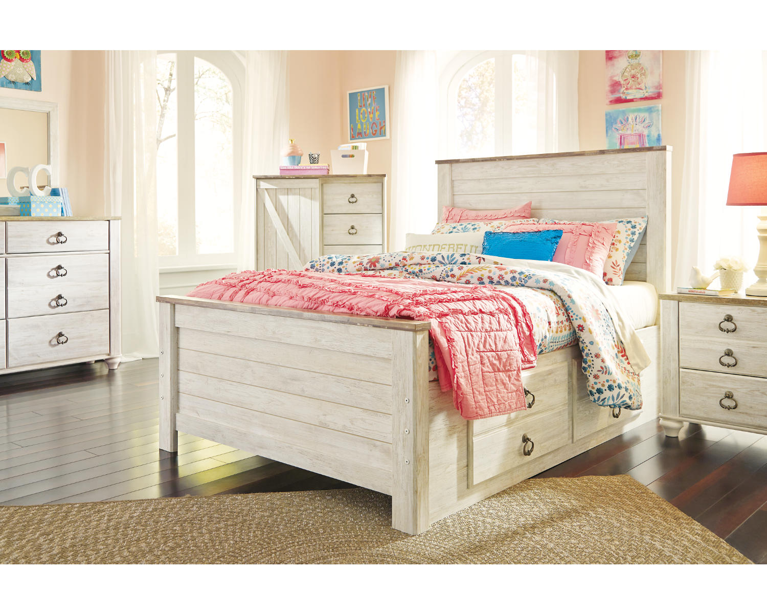 Experience a clean, modern bedroom centerpiece with the Willowton Full Panel Bed. This full-size bed combines a classic panel silhouette with built-in storage, making it ideal for compact spaces and anyone who values organization. Finished in a timeless whitewash, it brings bright, versatile style to a range of décor while keeping essentials close at hand.