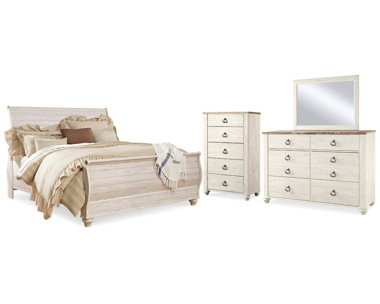 Introducing the Willowton King Sleigh Bed, Dresser, Mirror and Chest in a soft whitewash finish. This complete bedroom set is designed for rooms that value coordinated style, practical storage, and timeless elegance. The traditional sleigh profiles and bright finish create a versatile look that blends with a range of décors.
