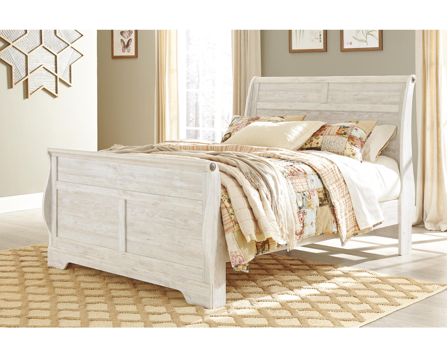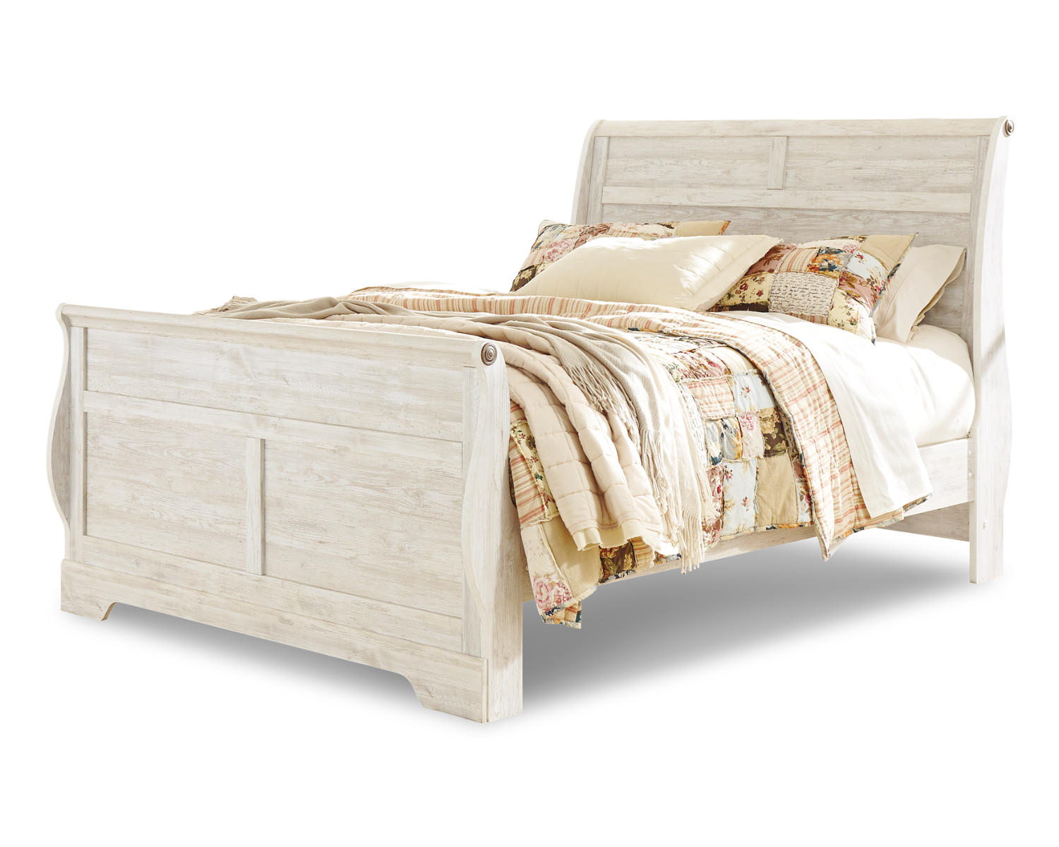 Durability and value are at the core of the Willowton Queen Sleigh Bed. The sturdy frame and enduring finish are built to resist daily wear, offering long-lasting performance that compares favorably with other beds in its class. Best of all, this whitewash sleigh bed is priced competitively, delivering a stylish, high-quality centerpiece for your bedroom without overspending.