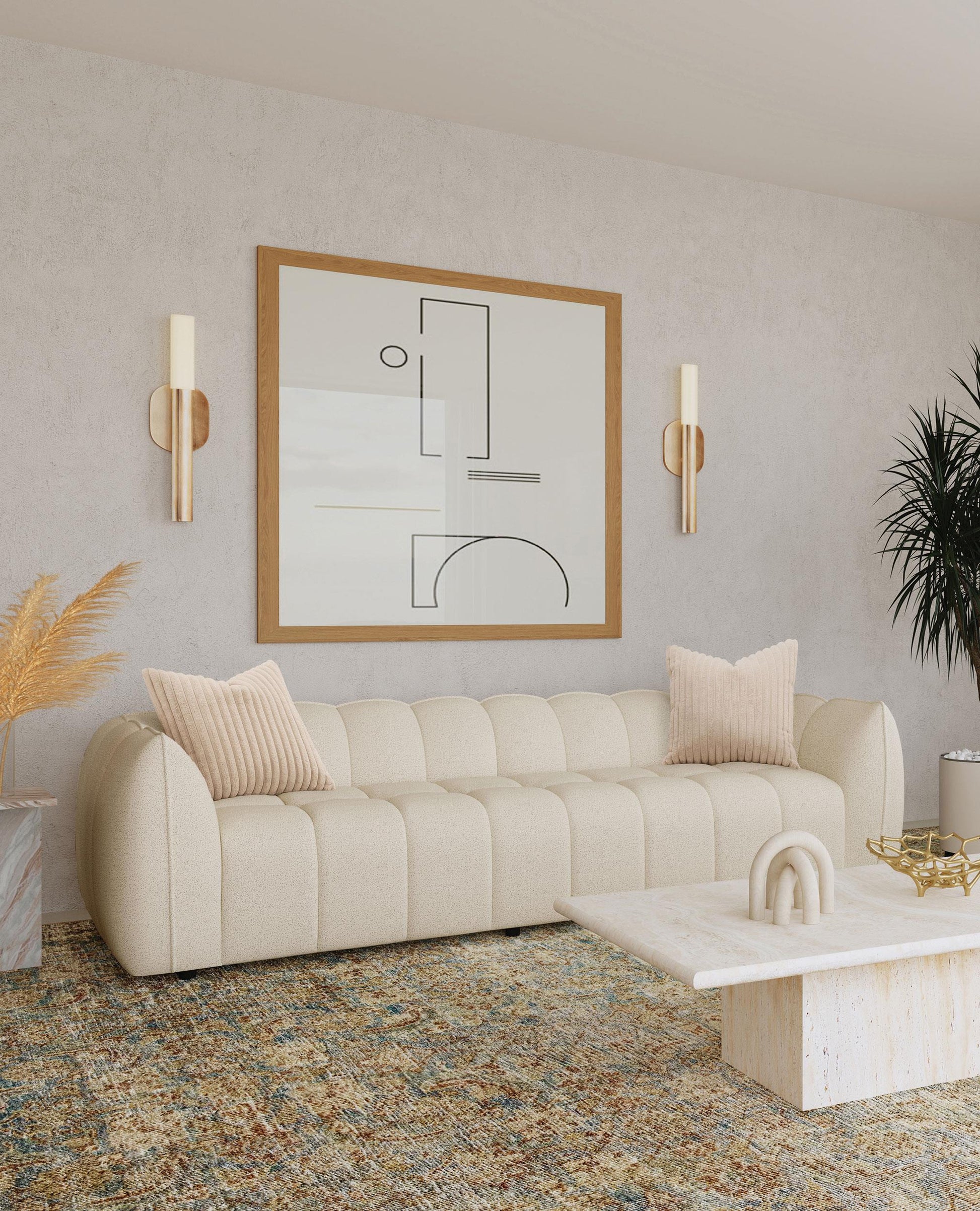 - Boucle upholstery in Sand Pebble adds texture and warmth to your living room.