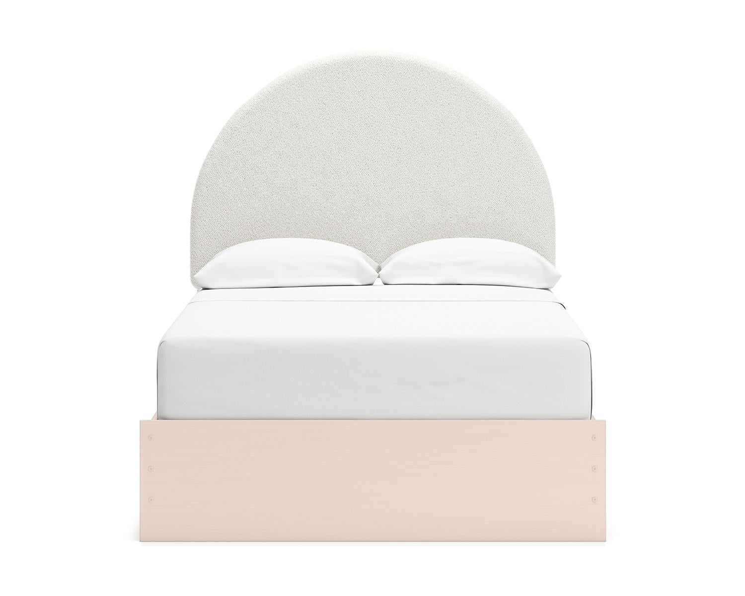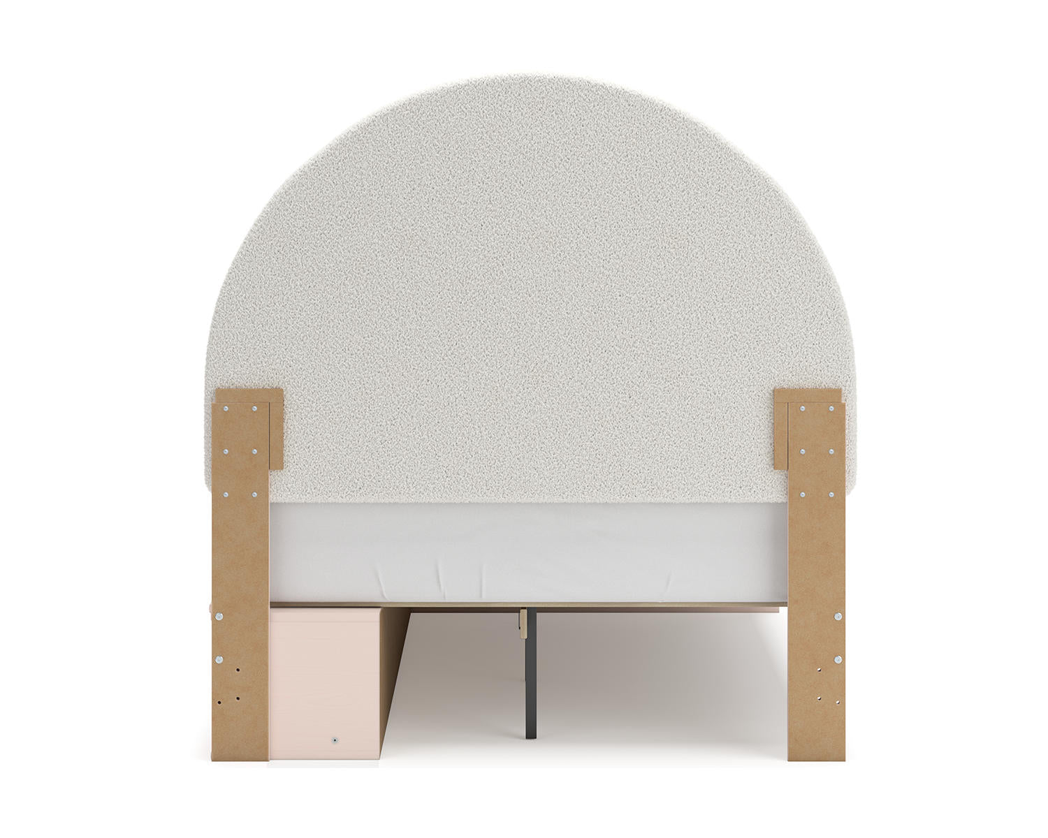 - Blush fabric upholstery brings a soft, contemporary look to any bedroom