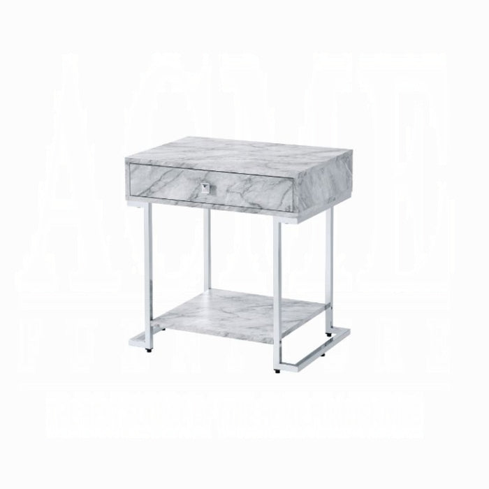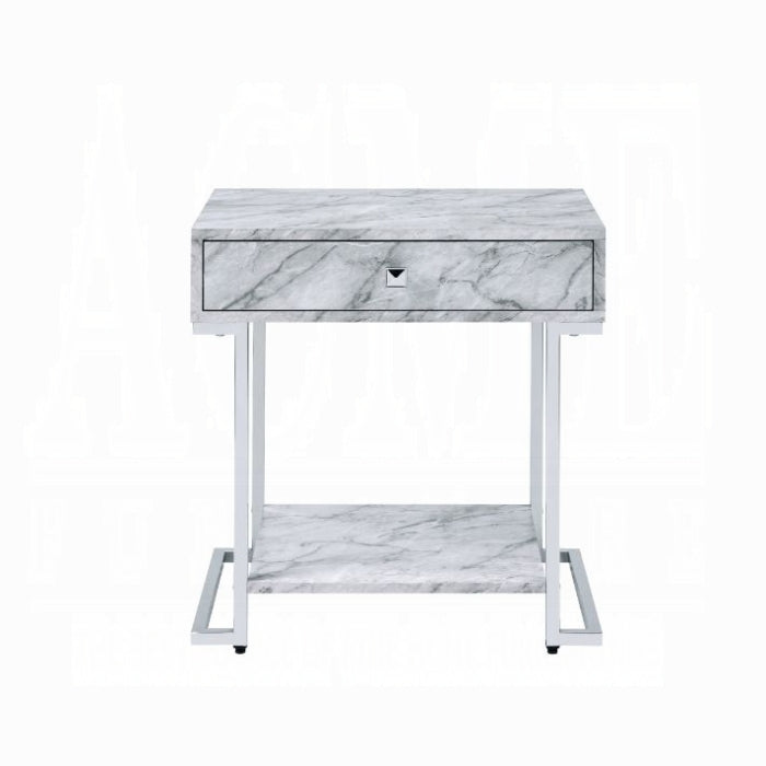 Meet a stylish, two‑tier accent table designed to add extra storage while enhancing your room decor. The metal sled base creates a modern silhouette with a chrome finish for a subtle, polished sheen. A white faux marble tabletop and bottom shelf offer textured surfaces that pair well with contemporary and classic styles alike.
