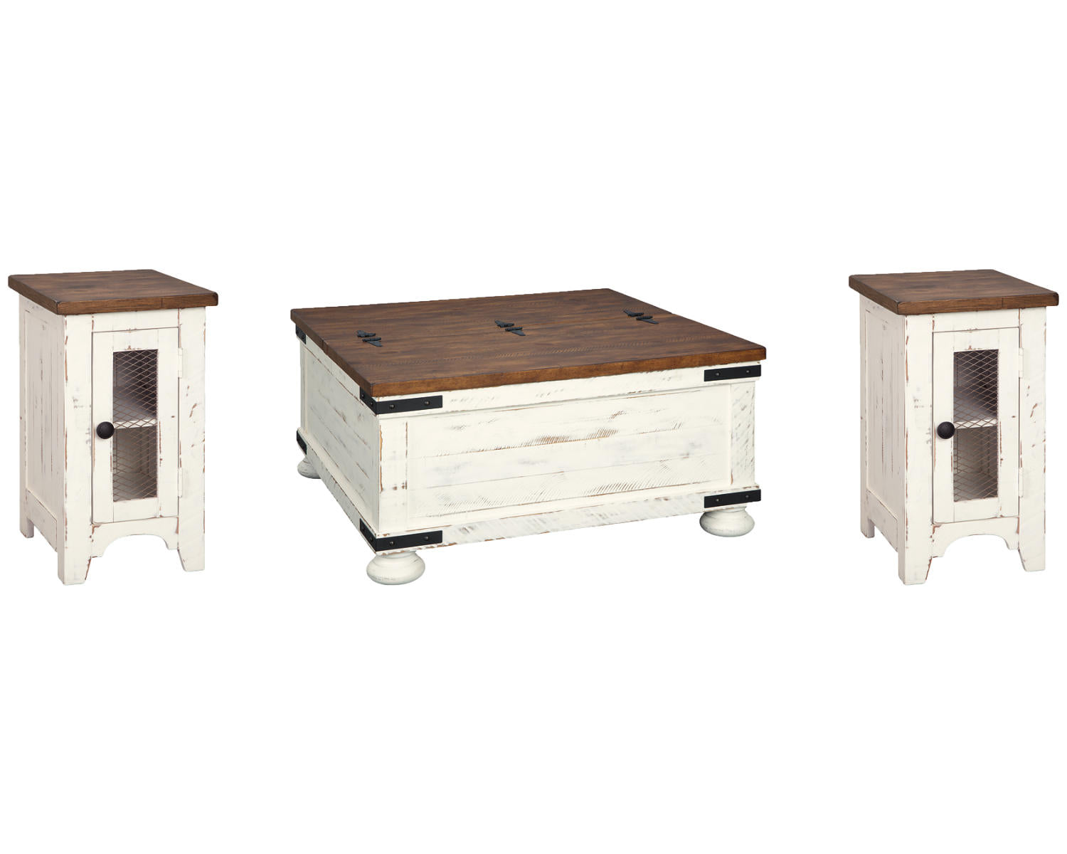 - Includes one coffee table and two chairside end tables in a White/Brown finish for a coordinated look