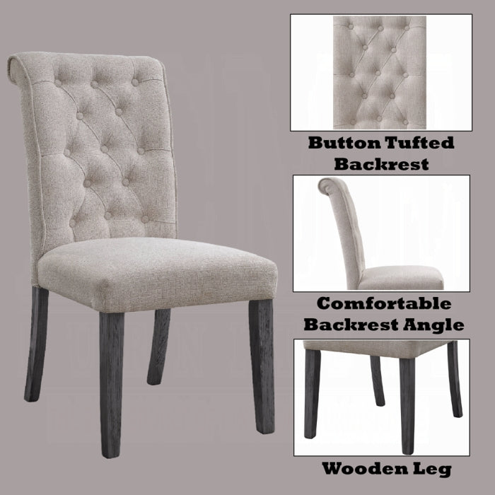 The Yabeina Side Chair (Set-2) brings a light, airy feel to your dining space with beige linen upholstery that fully covers its wooden frame. The rolled back design with tufted button details offers timeless charm and a refined silhouette. This two-chair set is a versatile addition to dining rooms, breakfast nooks, or living areas that call for classic flair.