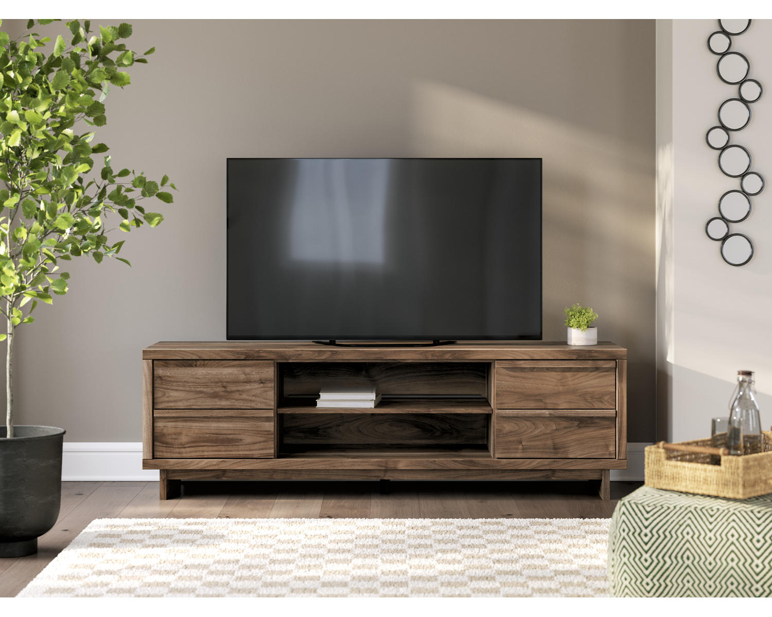 - Size & Finish: 72-inch wide media console in a rich brown finish that suits a wide range of decor styles.