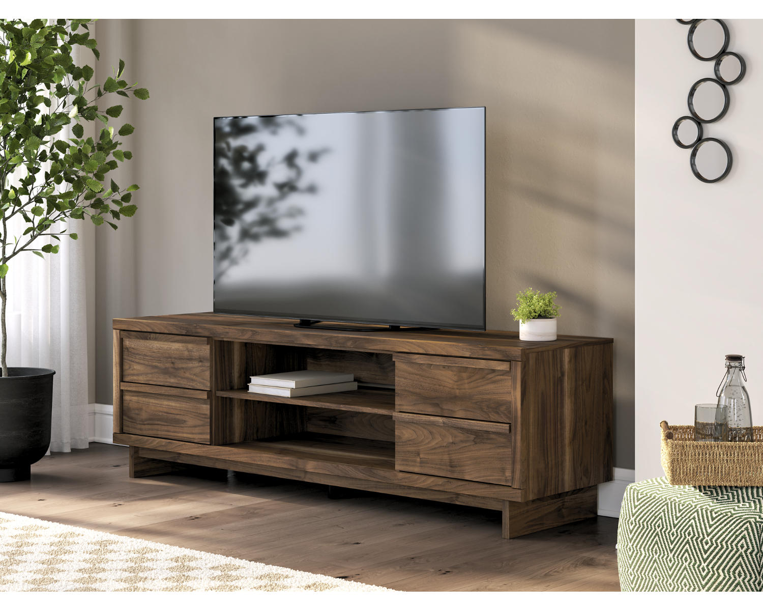 - Storage: open shelves and closed compartments to organize TVs, consoles, remotes, and media accessories.