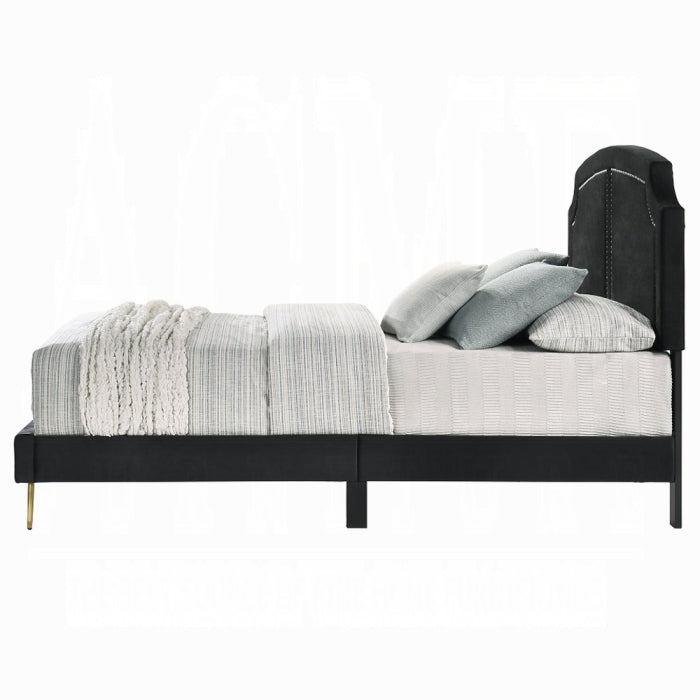 Introducing the Zeena EK Bed, a contemporary centerpiece for modern bedrooms. Black with gold accents, it exudes sophistication and chicness, designed for anyone who values style without compromising comfort. The headboard's gold-finished nailhead trim adds a refined touch, while the gold metal tapered legs create a striking contrast against the black finish.