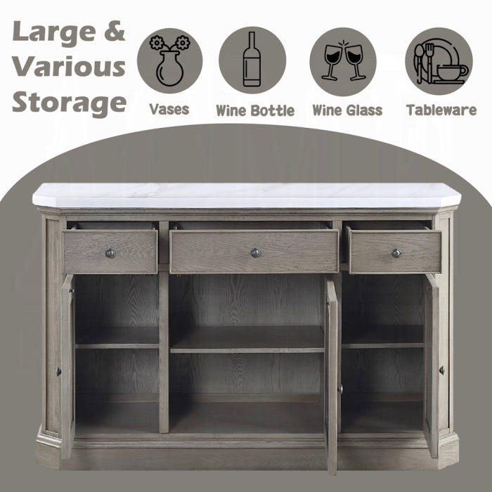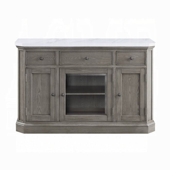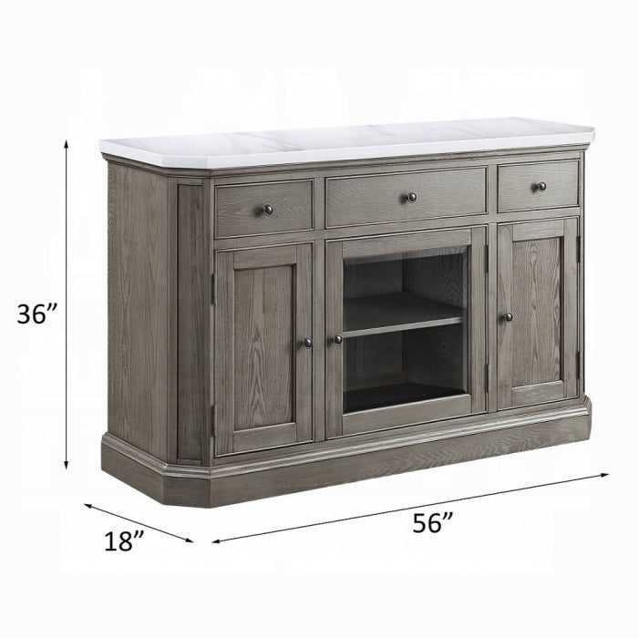 Serving a practical purpose while maintaining a classic design, the Zumala Server features a gracefully carved wooden base in a weathered oak finish for rich textures and vintage beauty. The white artificial marble top provides a clean, expansive counter space that is perfect for serving food and entertaining guests.